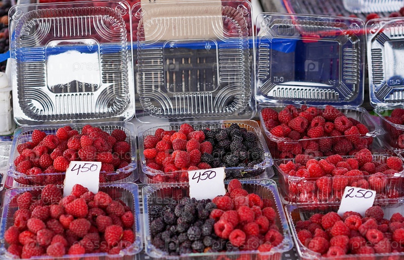 Красная и черная малина в пластиковых контейнерах