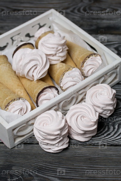 Вафельные рожки с начинкой из зефира. Упакован в деревянный поднос. Несколько копий сложены рядом. Зефир домашний. На сосновых досках. Взято сверху