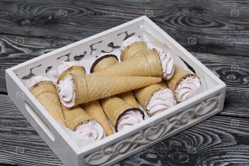 Вафельные рожки с начинкой из зефира. Упакован в деревянный поднос. Зефир домашний. На сосновых досках. Взято сверху