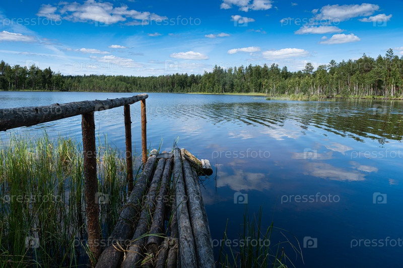 Вид на чистое лесное озеро. Озеро Мойно. Деревянные мосты. Псковская область. Великолукский район