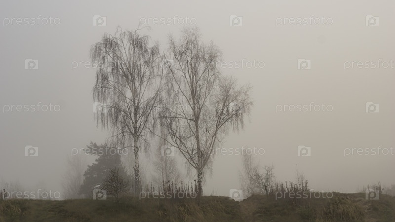 Деревья в тумане на озере в ноябре. Монино. Московская область