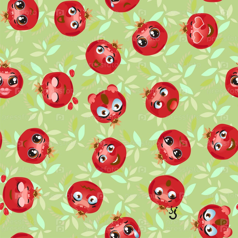 Бесшовный узор из экзотических фруктов граната. Смешные милые лица персонажей