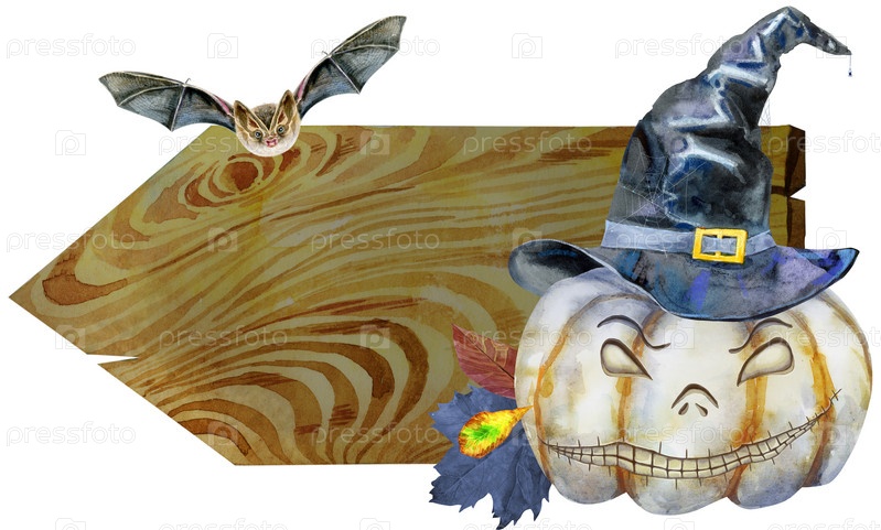 Акварель Хэллоуин. Ручной обращается праздничные иллюстрации с темной деревянной доской