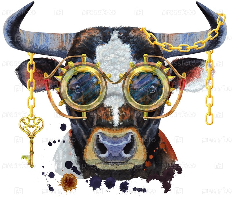Акварельная иллюстрация черного быка с белым пятном в очках стимпанк