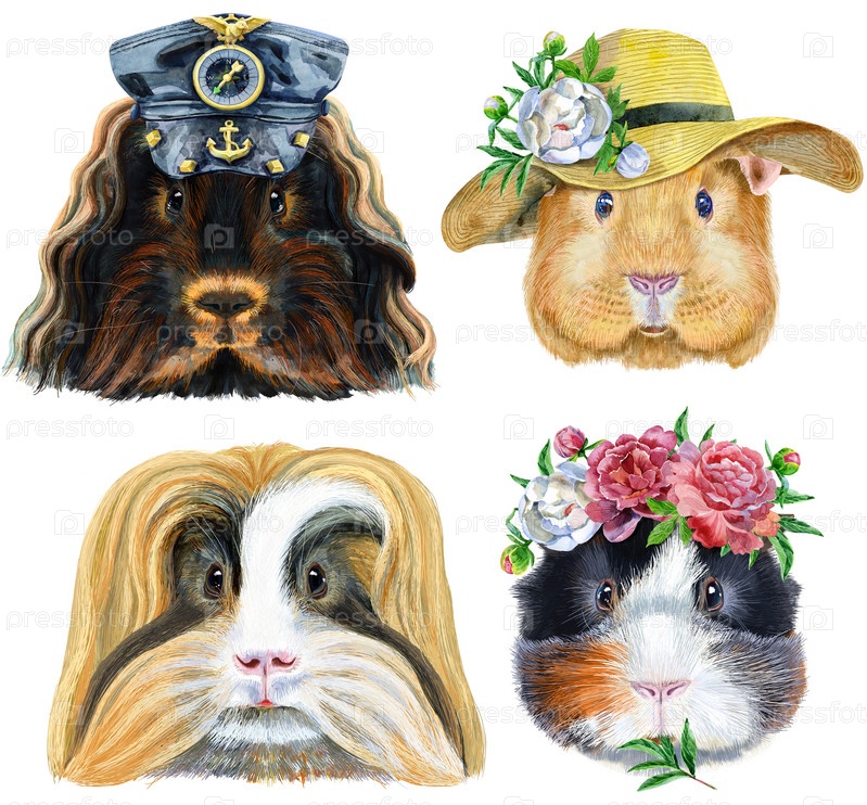 Акварельные портреты морских свинок на белом фоне