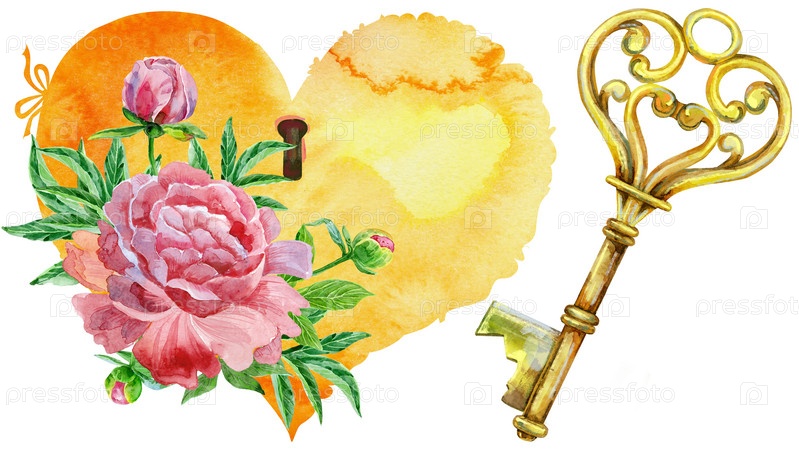 Акварель винтажное сердце, ключ и пионы на белом фоне