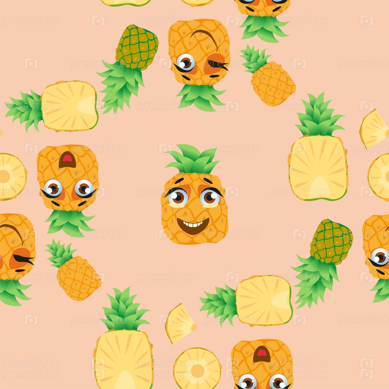 Бесшовный узор из экзотических фруктов ананаса. Смешные милые лица персонажей