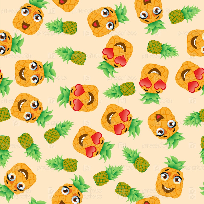 Бесшовный узор из экзотических фруктов ананаса. Смешные милые лица персонажей
