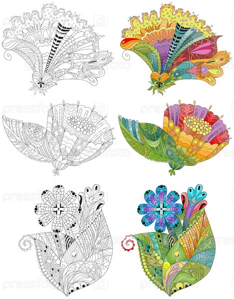 Цветы в стиле зентагле с четкими линиями для дизайна футболок, татуировок и других украшений Контур и набор цветов