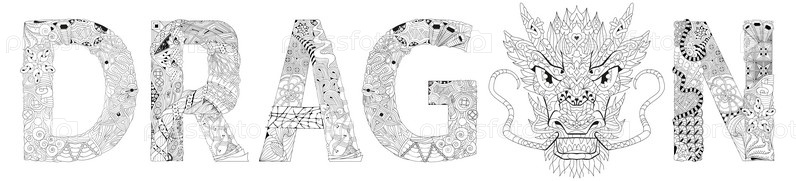 Художественный дизайн ручной росписи.Ручно нарисованное иллюстративное слово DRAGON с головой дракона для окраски, футболок и других украшений