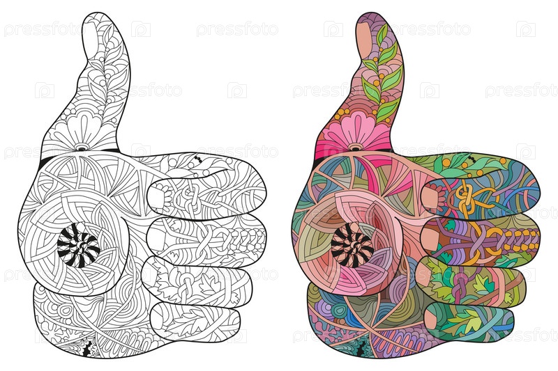 Рука поднимает вверх икону в стиле zentangle с чистыми линиями для антистресса, дизайна футболки, татуировки и других украшений