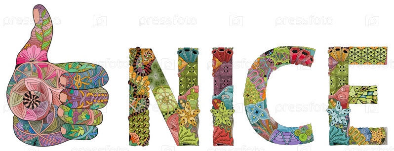 Рука поднимает вверх икону стиля zentangle со словом NICE с чистыми линиями для антистресса, дизайна футболки, татуировки и других украшений