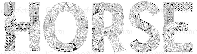 Художественный дизайн ручной росписи. Нарисованная вручную иллюстрация слова "лошадь" для раскраски, футболки и других украшений