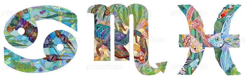 Художественный дизайн ручной росписи. Ручной рисунок слов Рыбы, Рак и Скорпион для футболки и других украшений