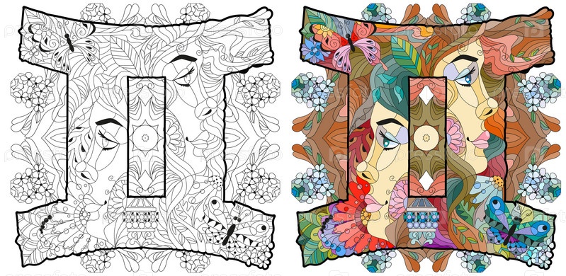 Знак зодиака Близнецы с мандалой, концепт-арт астрологии. Дизайн татуировки. Набор цветов и контуров