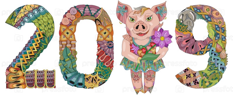 Иллюстрация Zentangle с свиньей и номером 2019.Зентангл или поросенок-каракули.Свинок в стиле зэнтангл для дизайна футболок, татуировок и других украшений
