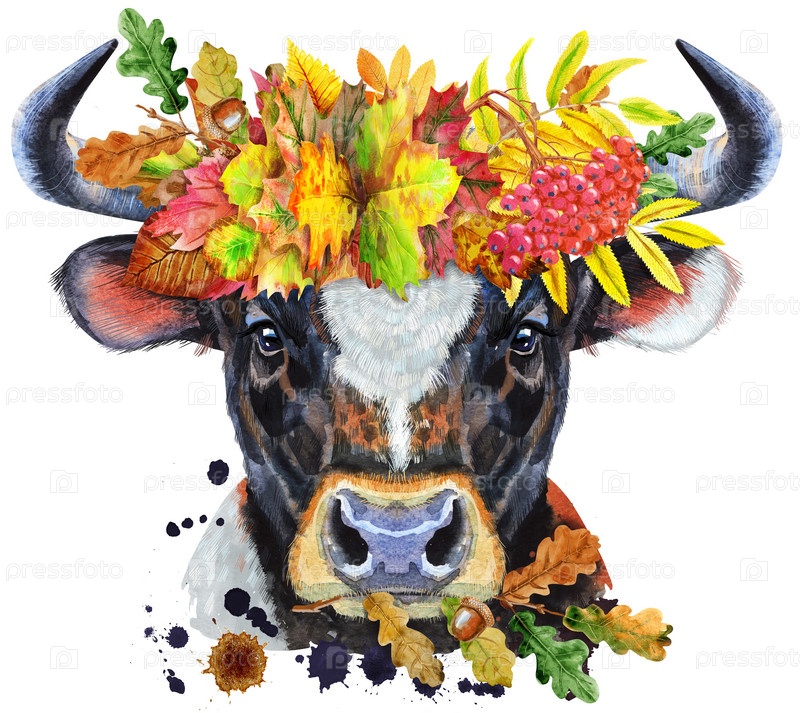 Акварельная иллюстрация черного быка с белым пятном в венке из осенних листьев