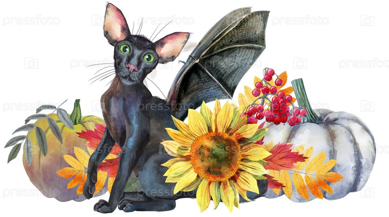 Акварельная иллюстрация милый черный кот с крыльями летучей мыши с тыквой на Хэллоуин
