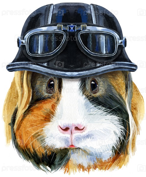 Милая морская свинка. Свинья для графики на футболках. Акварельная морская свинка Шелти с иллюстрацией байкерского шлема