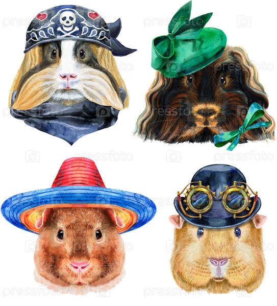 Морские свинки для графики на футболках. Акварельная иллюстрация тощей морской свинки