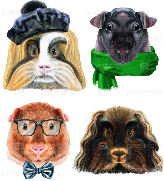Морские свинки для графики на футболках. Акварельная иллюстрация тощей морской свинки