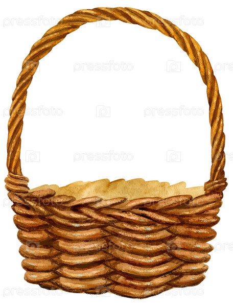 Акварель пустая коричневая корзина. Соломенная корзина с деревенской ручкой. Старинный контейнер для пикника. Ручная иллюстрация, клипарт, элемент, изолированный на Пасху, дизайн сада