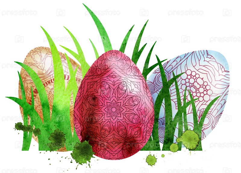 Акварельные пасхальные яйца и зеленая трава на белом фоне. Элемент дизайна для поздравительных открыток, открыток и приглашений