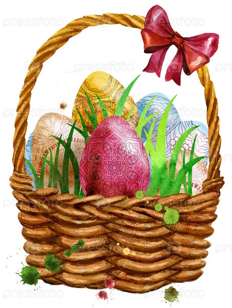 Акварельная иллюстрация пасхальной корзины с яйцами