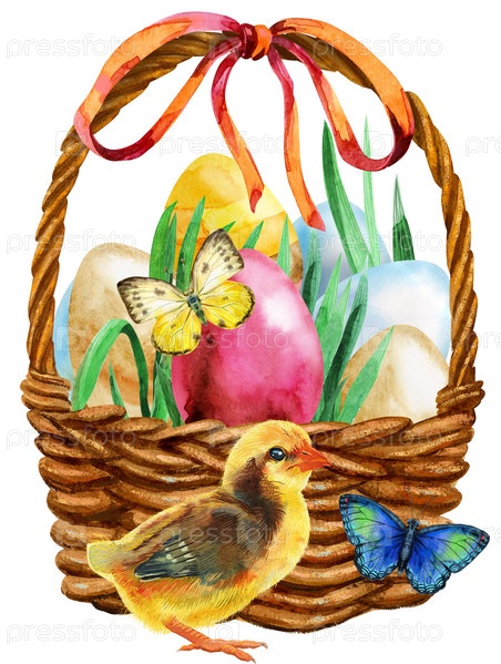 Акварельная иллюстрация пасхальной корзины с яйцами и курицей