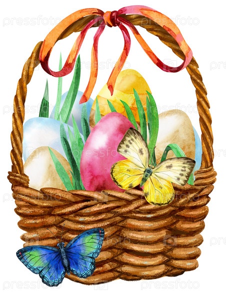 Акварельная иллюстрация пасхальной корзины с яйцами