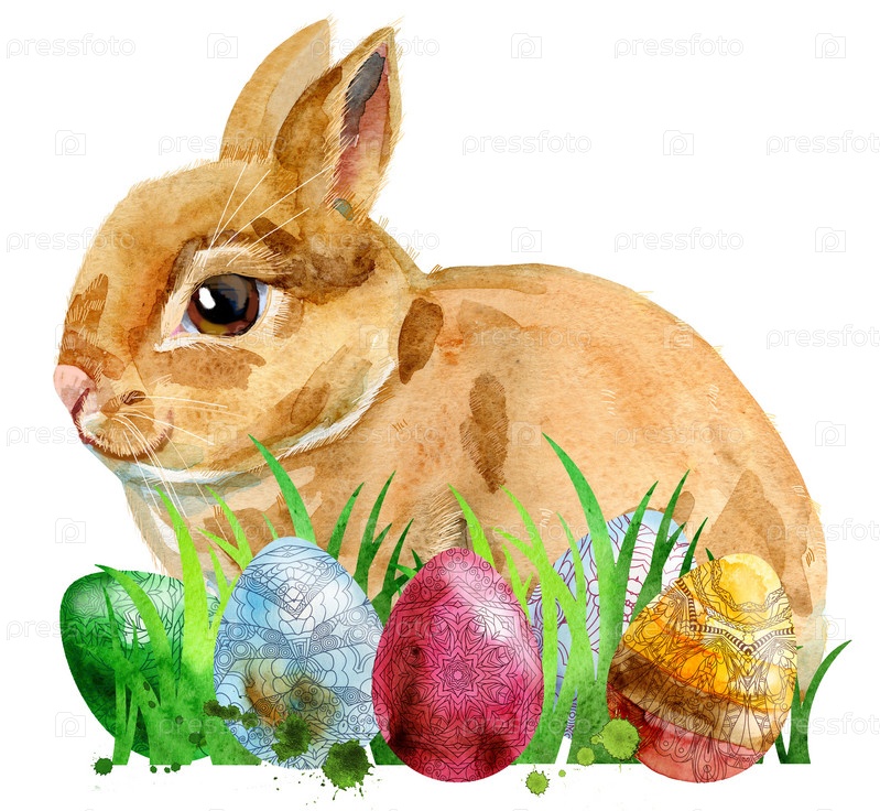 Симпатичный бежевый кролик на белом фоне с яйцами и травой, изолированный