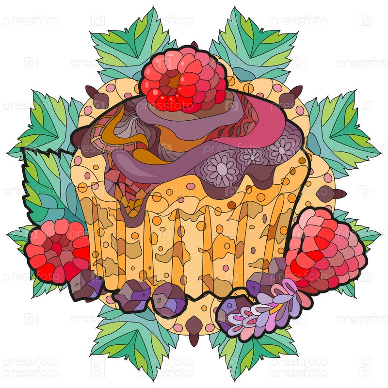 Векторный торт с шоколадом и малиной с абстрактными орнаментами.Ручная иллюстрация для футболки в стиле зентенгл, каракули