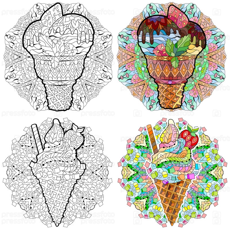 Мороженое нарисовано черно-белым контуром для раскраски страницы с мандалой. Набор цветов и контуров