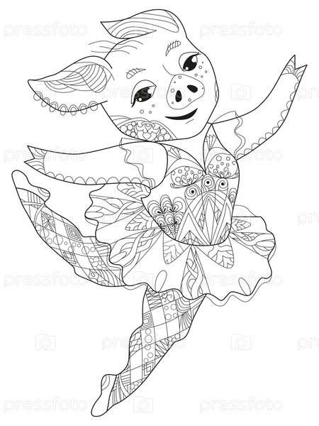 Свинья-балерина в стиле зентангл для дизайна футболок, татуировок и других украшений