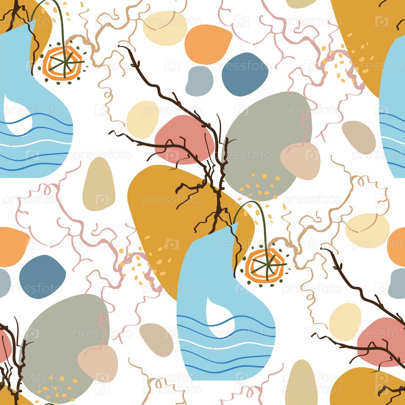 Бесшовные абстрактные плакаты с вазами. Модный коллаж натюрморта с горшком, фруктами, вазой и тропическим пальмовым листом