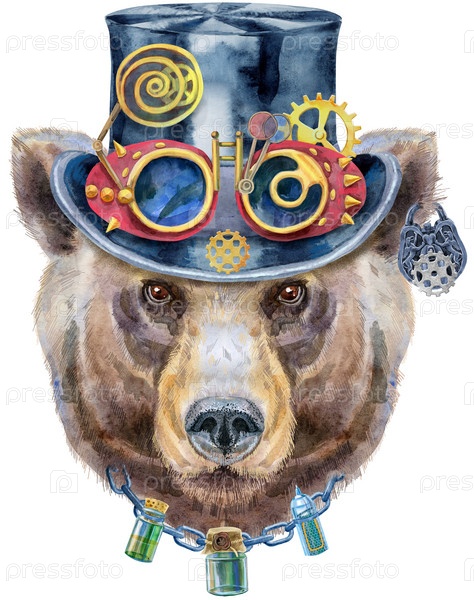 Портрет медведя в стимпанк-шапке с очками. Иллюстрация акварели бурого медведя. Прекрасный мир дикой природы