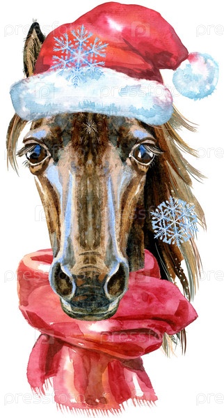 Портрет лошади в шляпе Санта-Клауса с красным шарфом на белом фоне. Акварельная иллюстрация лошади