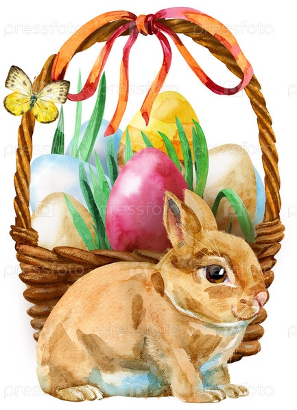 Акварельная иллюстрация пасхальной корзины, наполненной яйцами, и маленького белого пасхального кролика, сидящего перед ней