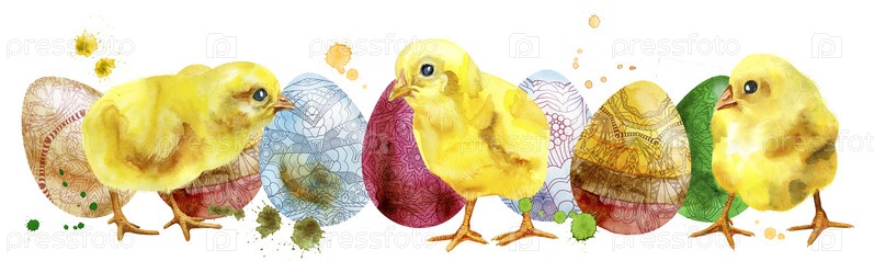 Акварельные пасхальные яйца и цыплята на белом фоне. Элемент дизайна для поздравительных открыток, открыток и приглашений