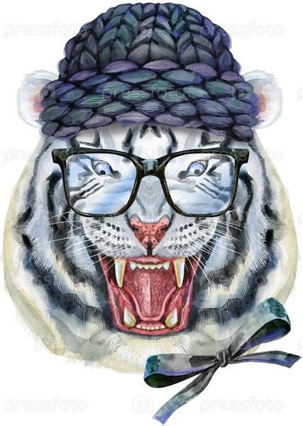 Ручной рисунок тигра в черной зимней шапке. Акварельный рисунок головы белого тигра, голубые глаза