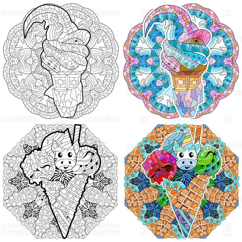 Мороженое нарисовано черно-белым контуром для раскраски страницы с мандалой. Набор цветов и контуров