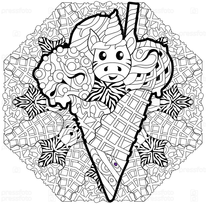 Цветочная, декоративная, сладкая десертная композиция с мандалой. чёрно-белый фон. страница цветной книги Zentagle. мороженое