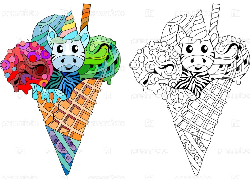 Ручно нарисованный красочный мороженый зэнтгел с иллюстрацией головы единорога