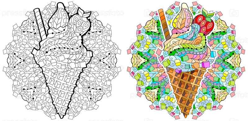 Мороженое с мандалой нарисовано черно-белым контуром для раскраски страницы. Набор цветов и контуров