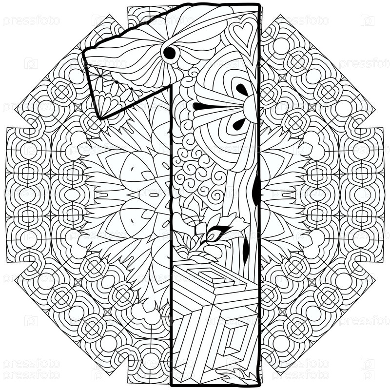 1 номер винтажного шрифта на мандале для раскрашивания. Дизайн гравировки. Векторная иллюстрация