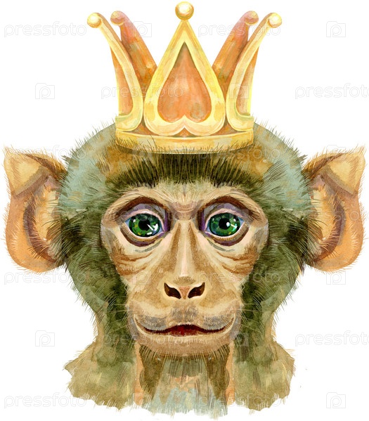 Обезьяна с золотой короной. Акварельные иллюстрации, изолированные на белом фоне. Король обезьян