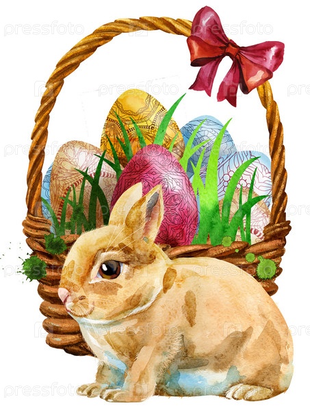 Акварельная иллюстрация пасхальной корзины, наполненной яйцами, и маленького белого пасхального кролика, сидящего перед ней