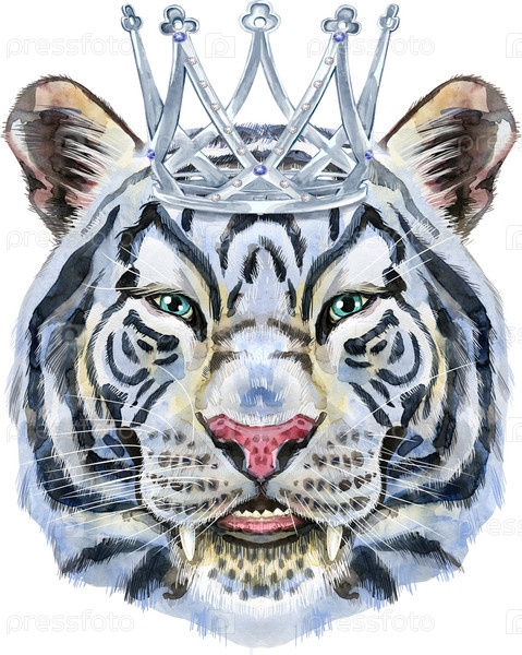 Акварельная иллюстрация белого улыбающегося тигра с серебряной короной