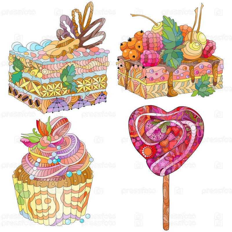 Векторные кусочки сладости на палочке с абстрактными орнаментами.Ручная иллюстрация для футболки в стиле зентенгл, каракули