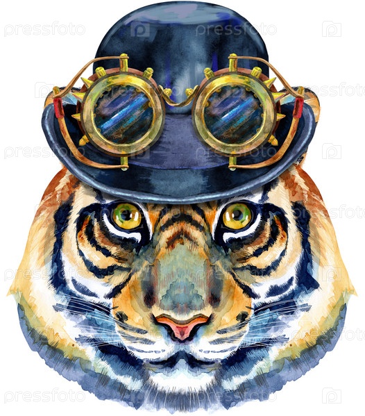 Тигр в котелке и очках в стиле стимпанк. Акварельная иллюстрация с брызгами на белом фоне